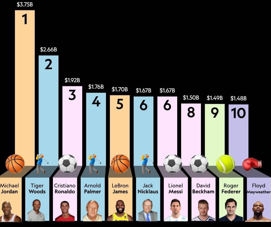 同时,足球巨星C罗以19亿美元位列第三,而梅西紧随其后,以16亿美元的财富排名第六。这些运动员的成功也反映了他们在各自领域所取得的非凡成就。 根据外媒的统计数据显示,乔丹的绝对优势不容忽视,他的收入几乎是其他运动员的两倍多。乔丹不仅是NBA历史上最为伟大的球员之一,他也是体育界最具影响力和知名度的人物之一。