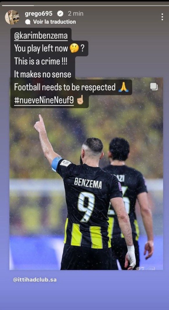 随后本泽马的弟弟格雷西在社交媒体上批评吉达联合主帅加拉尔多的排兵布阵,称其安排本泽马在左路踢球是“犯罪”和“毫无道理”,并强调足球应受到尊重。