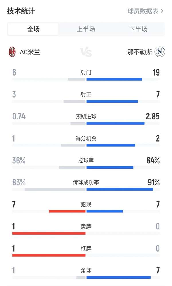 防守端,米兰球员共领到1张黄牌和1张红牌,犯规次数与对手持平均为7次。这场胜利让米兰暂时登上意甲榜首位置,而那不勒斯在占据绝对场面优势的情况下未能把握得分良机,全队2次绝佳机会仅把握住1次,最终吞下失利的苦果。