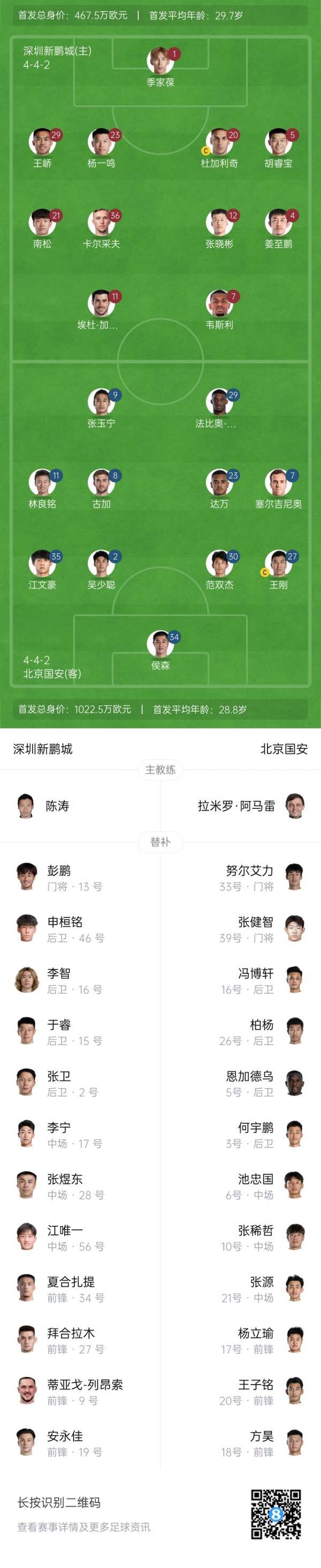 新鹏城本场排出防守反击阵型,杜加利奇领衔后防线,加西亚与卡尔采夫坐镇中场,韦斯利突前。国安则延续442体系,张玉宁与法比奥组成锋线双枪,林良铭、古加等主力悉数登场。