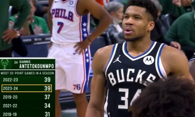 字母哥本赛季第39次单场30+追平个人单赛季