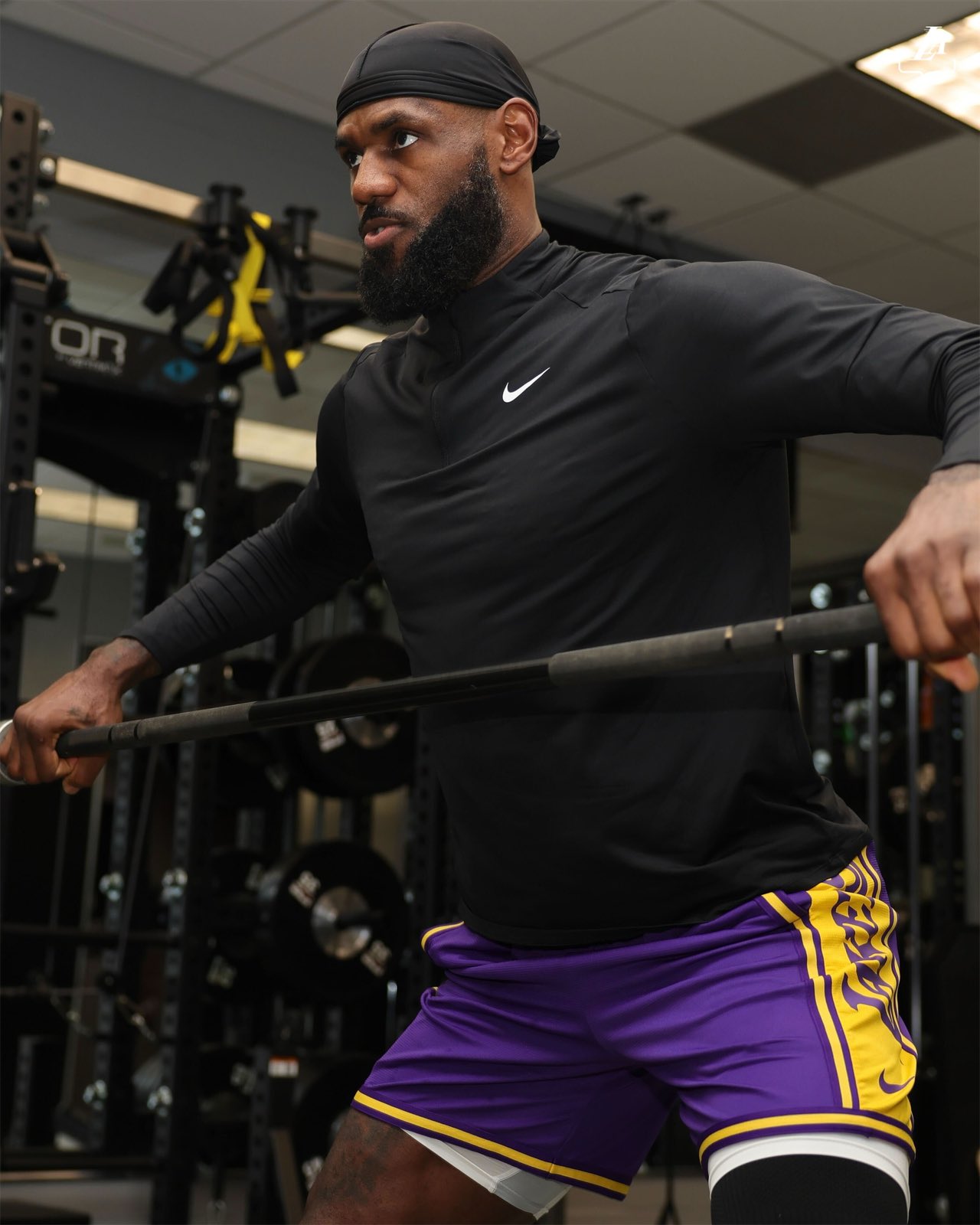 湖人队将在当天晚上10:30分主场迎战老鹰队,这必将是一场备受瞩目的比赛。 照片中,勒布朗-詹姆斯身穿湖人队训练服,矗立在训练厅中。在举重区域,他正在专注地进行力量训练。这一场赛前热身训练不仅显示了他作为球队领袖的责任心,也展现了他对比赛的严谨态度。 湖人官方推特以“赛前举重”为题,配以照片,形象地向球迷们展示了球队成员们备战的决心和投入。