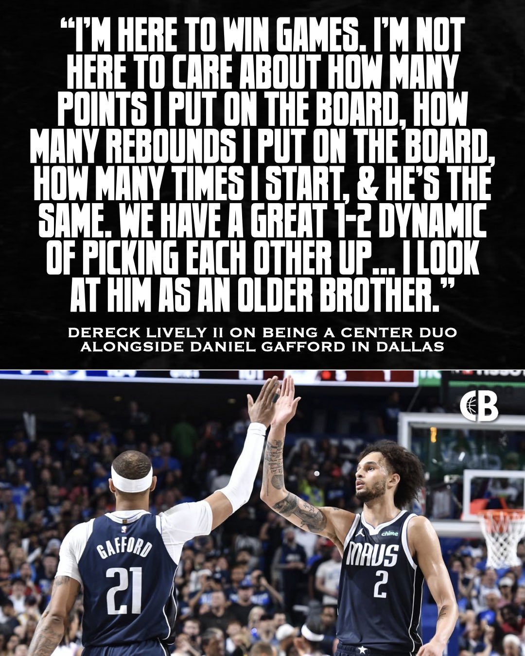“我来是为了赢球的,我不关心我拿了多少分,抢了多少板,首发多少次,他也一样。我俩之间有一种很棒的默契,我视他为哥哥。”莱夫利表示。