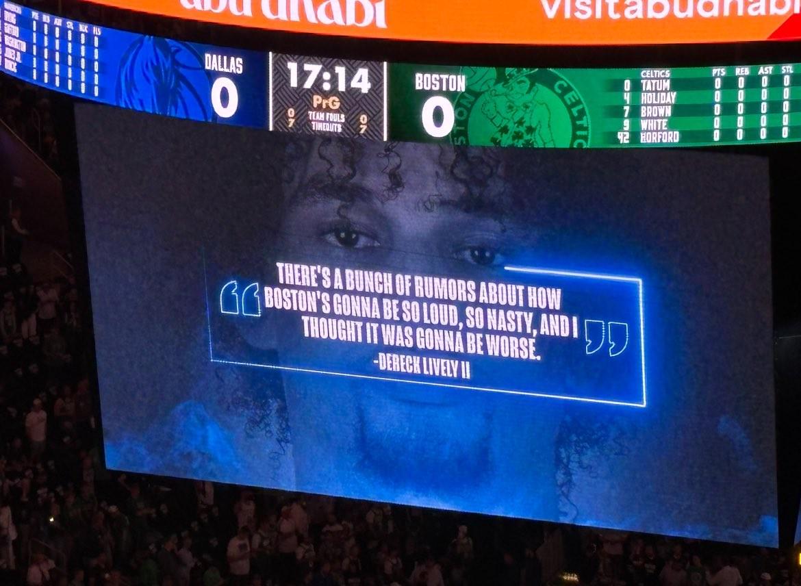 莱夫利此前在接受采访时表示:“说实话,我没想到(现场球迷)声音那么大。”这句话被凯尔特人队捕捉到,并放在了大屏幕上。这一举动让现场球迷备感自豪,并更加激发了他们的热情。