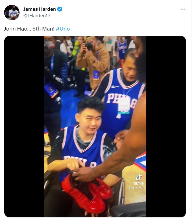 时间来到2023年的季后赛,哈登特地邀请小郝来到现场观战,并在比赛前给了对方一个大大的拥抱。在比赛中,哈登再次炸裂,拿下了42分8篮板9助攻4抢断,带领球队扳平了大比分。而在比赛结束后,哈登还送给小郝一双自己的签名球鞋,并送上祝福。