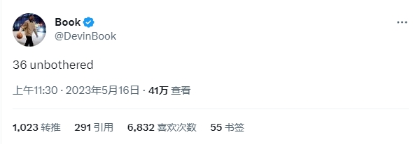 来源:直播82023-05-16 14:48:275月16日,菲尼克斯太阳队的球星德文·布克在个人社交媒体上发布了一条更新,他写道:“36,未受干扰。”这条消息引发了媒体和球迷们的关注。