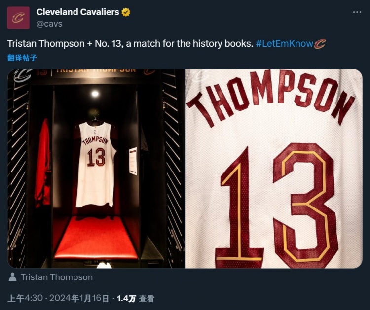 特里斯坦-汤普森生涯前9个赛季都在骑士效力,他以13号球衣创造了许多辉煌时刻。本赛季特里斯坦-汤普森以底薪回归骑士后,一开始选择了12号球衣,但现在他决定回归自己的传统号码。