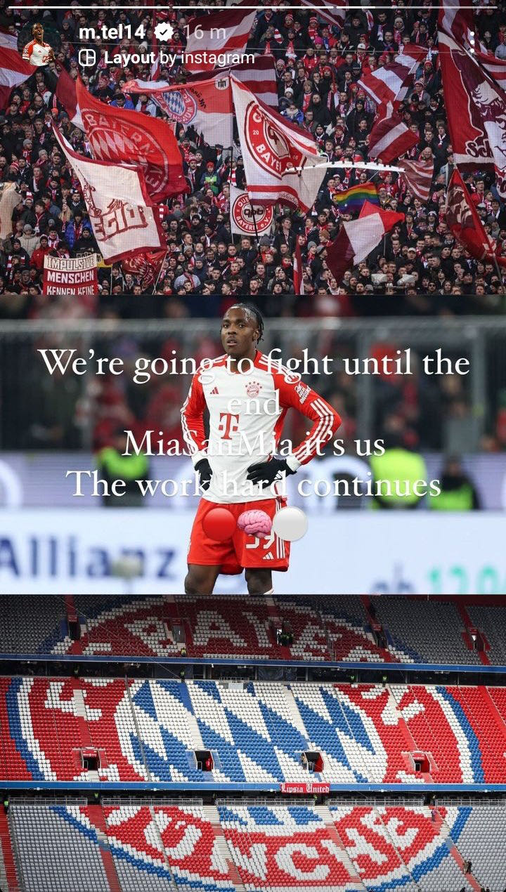 在这场比赛中,拜仁慕尼黑的小将特尔替补出战,并且展现出了出色的表现,几次差点帮助球队扳平比分。赛后,特尔在自己的INS上发文表达了自己的决心和努力。 特尔在发文中表示:“我们将会战斗到最后时刻,Mia San Mia就是我们的座右铭,我们会继续努力工作。”特尔以其无限的潜力和出色的表现,为拜仁慕尼黑增添了不少亮点。拜仁慕尼黑本场比赛表现不佳,未能取得胜利。特尔的出色发挥为球队带来了一线希望。特尔作为一名年轻的球员,已经展现出了非凡的才华和潜能,他的表现为球队提供了可贵的替补力量。 对于拜仁慕尼黑来说,这次失利无疑是一个巨大的打击,但球队绝不会轻易放弃。特尔的发言也再次表明了球队的决心和士气。他的表态向球迷们传递出了一个信息,那就是球队将会坚持到最后一刻,继续全力以赴。 作为德甲联赛的领头羊,拜仁慕尼黑需要从这场失利中吸取教训,并及时调整战术和球队状态。