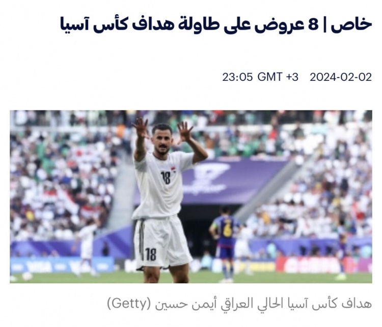 埃曼-侯赛因在本届亚洲杯赛事中的出色表现让他成为射手榜的领跑者,他在4场比赛中打入6球,成为球队的得分机器。 消息人士透露,埃曼-侯赛因通过经纪人收到了来自卡塔尔、沙特、伊朗、阿联酋、土耳其、韩国和埃及俱乐部的报价。他尚未做出最终决定,因为他有足够的时间来考虑自己的未来。尤其是因为FIFA已经判罚他无法在本赛季代表新的俱乐部参赛。 埃曼-侯赛因在夏天加盟卡萨布兰卡拉贾,并在10月份免签加盟了巴格达空军。这使得他无法再代表新的俱乐部参加比赛。尽管如此,埃曼-侯赛因依然备受各俱乐部的追捧,他将有足够的时间考虑接下来的职业发展。 埃曼-侯赛因的出色表现并不仅仅受到亚洲俱乐部的关注,还吸引了来自非洲俱乐部的目光。
