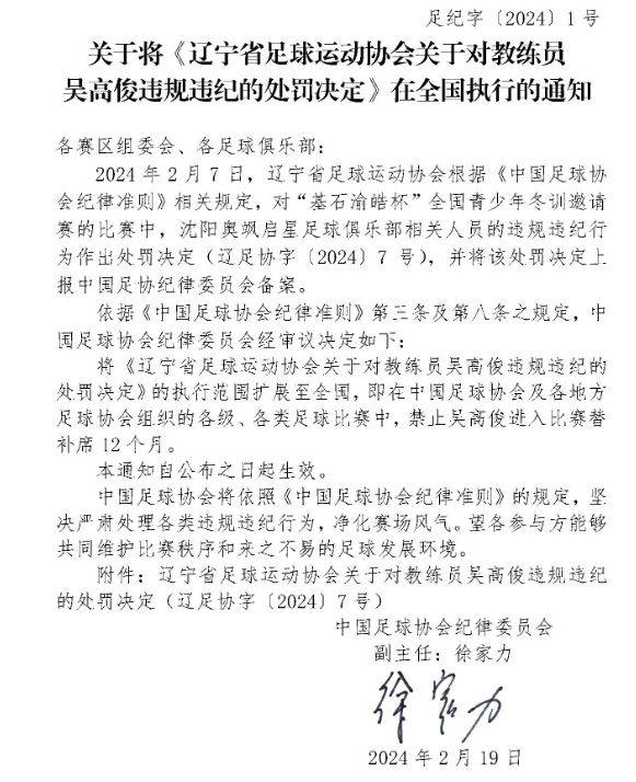 吴高俊教练员及沈阳奥飒启星足球俱乐部全国性处罚公告