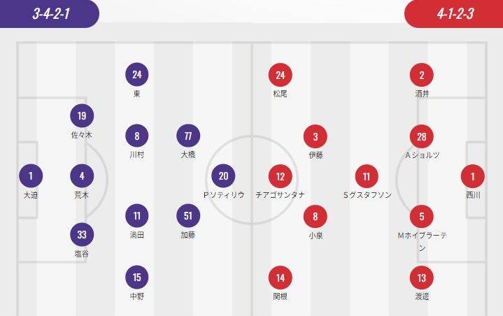 两队在经过长时间的备战后,终于确定了首发阵容。比赛注定会是一场备受瞩目的对决,两支劲旅的实力都不容小觑。 广岛三箭首发阵容为3-4-2-1,门将位置由大迫敬介担任。后卫线上,塩谷司、荒木隼人和佐佐木翔将负责守卫球门。中场将由加藤陸次樹、大橋祐紀、川村拓夢、中野就斗和満田誠组成,他们的任务是保护球门并为前锋提供支援。索蒂里奥将担任独自一人的前锋。 而浦和红钻首发阵容则是4-1-2-3的阵型。西川周作将出任门将,后卫线上酒井宏樹、舒尔茨、赫伊布罗滕以及渡邊凌磨将组成坚实的防线。中场方面,古斯塔夫松、小泉佳穂和伊藤敦樹将通过快速的进攻串联前场。