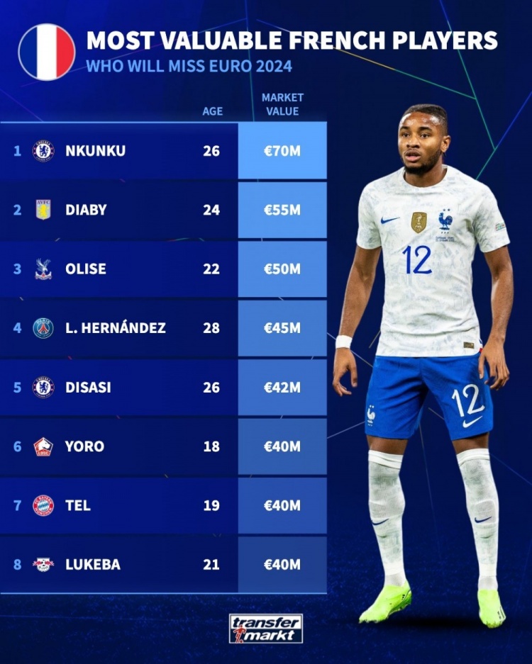 法国无缘欧洲杯球员身价榜揭晓:恩昆库领衔