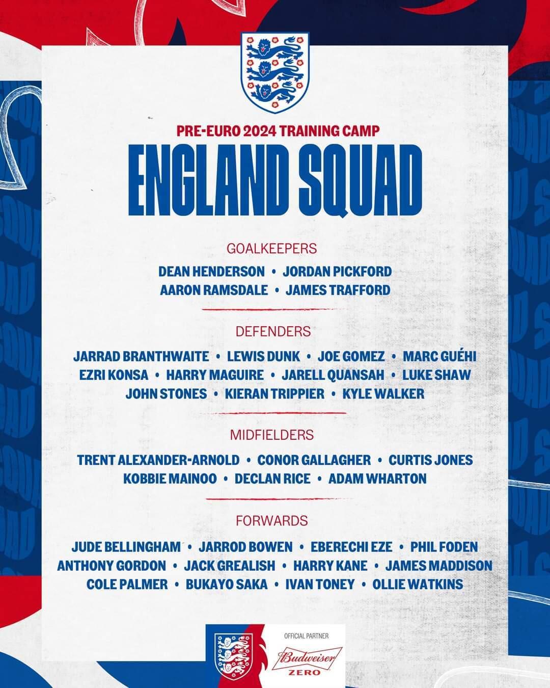 初选名单中至少还有7名球员无法参加本届欧洲杯,这意味着他们将错过这一盛事。英格兰队被分入C组,同组对手包括塞尔维亚、丹麦以及斯洛文尼亚,备战工作将进入紧张的阶段。