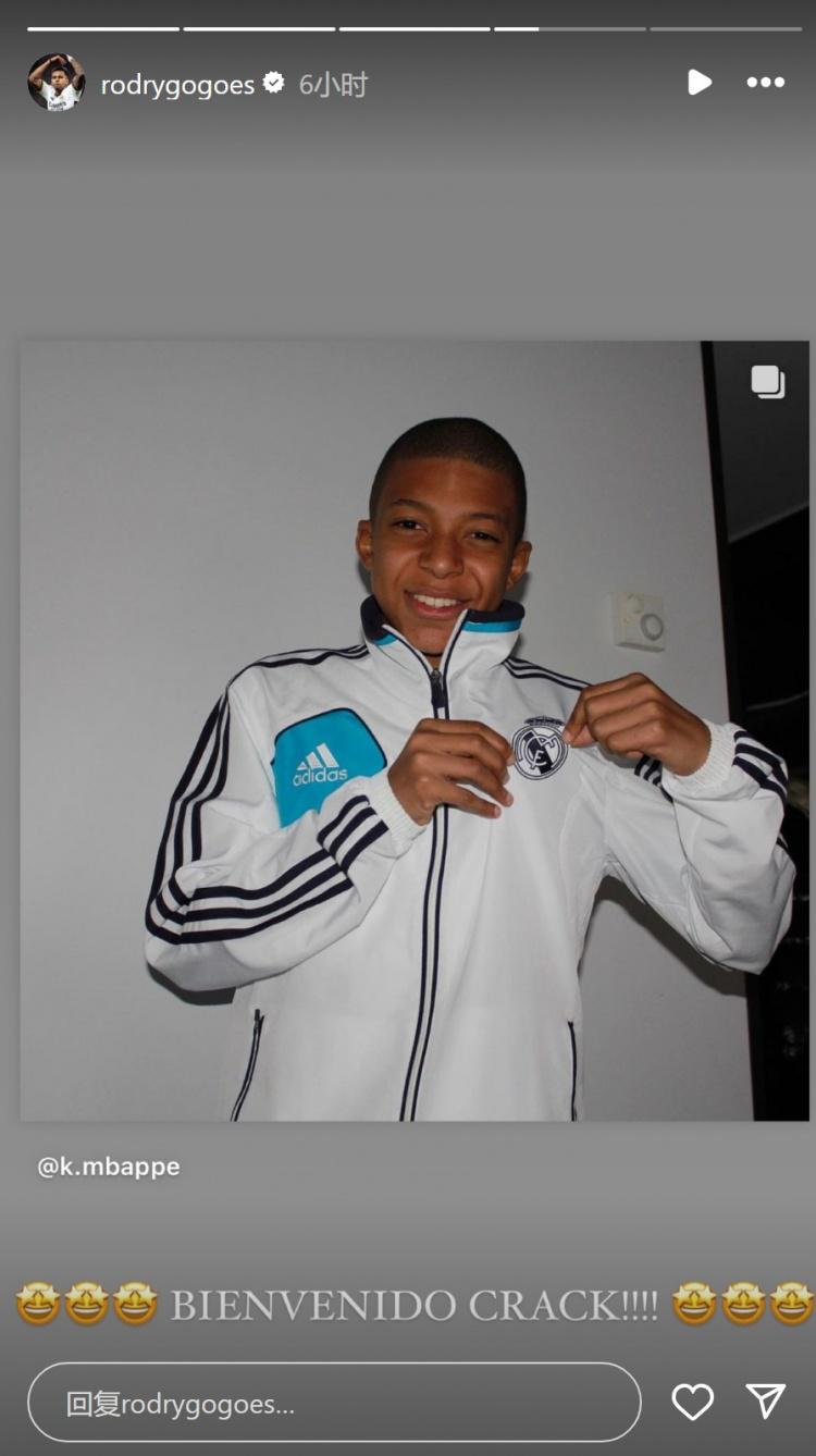 而在姆巴佩宣布加盟之前,罗德里戈在社交媒体上发表了一条热情洋溢的欢迎留言。他晒出了姆巴佩小时候身穿皇马球衣的照片,并配文:“欢迎你,天才!”