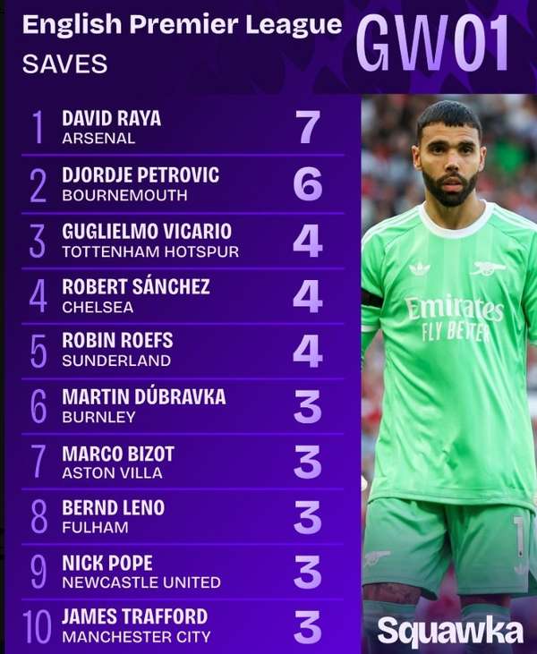 英超首轮门将扑救榜:拉亚七次扑救惊艳全场 佩特洛维奇紧随其后