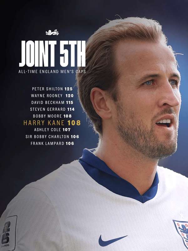 来源:直播82025-09-07 16:13:48英格兰与安道尔的世界杯预选赛中,凯恩首发出战,帮助球队以2-0的比分取得胜利。这场比赛也标志着凯恩的国家队出场次数达到108场,与传奇后卫博比-摩尔并列英格兰队史第五位,跻身国家队出场记录的精英行列。英格兰国家队官方社交媒体随即发布了一张纪念海报,以表彰凯恩的卓越贡献。