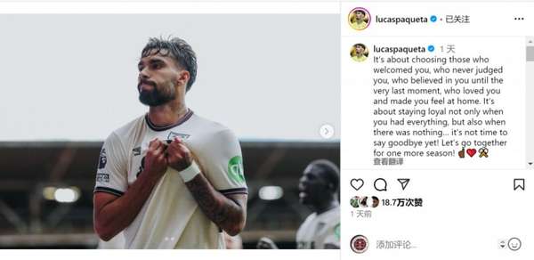 来源:直播82025-09-13 08:06:50西汉姆联中场核心卢卡斯·帕奎塔今日通过个人社交媒体正式确认新赛季将继续为“铁锤帮”效力。这位巴西国脚发布了一张手持球队队徽的照片,并配发长文深情表态,明确否认了此前盛传的离队传闻。