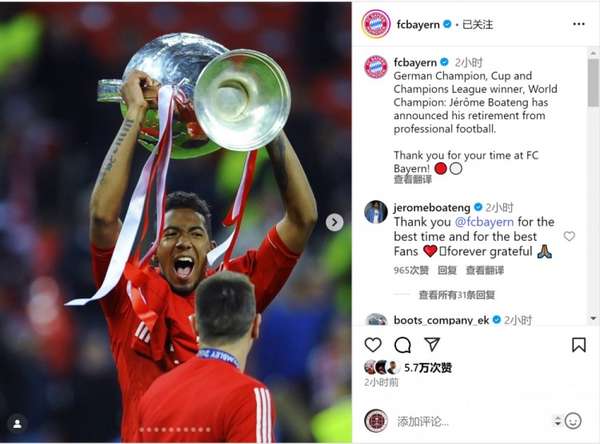 传奇落幕!博阿滕宣布退役,拜仁官方深情致敬欧冠功勋