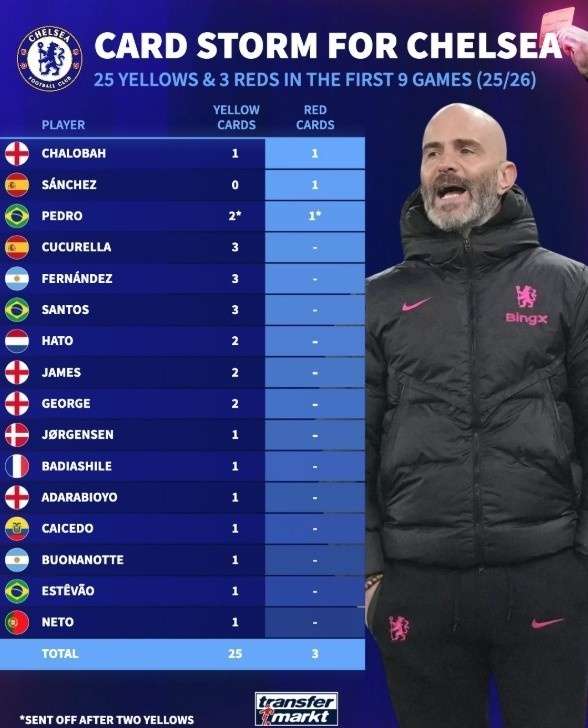来源:直播82025-10-01 14:47:31德国转会市场最新数据显示,切尔西在本赛季开局阶段遭遇严重纪律问题。前9场正式比赛中,蓝军累计收到25张黄牌与3张红牌,这一数据引发业内关注。