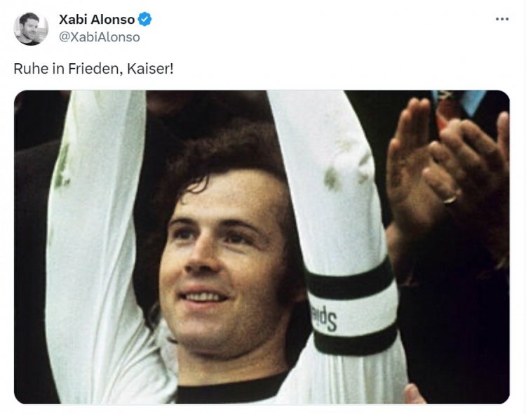 消息传来后,勒沃库森主帅哈维-阿隆索在社交媒体上发文悼念贝肯鲍尔:“安息吧,足球皇帝!”